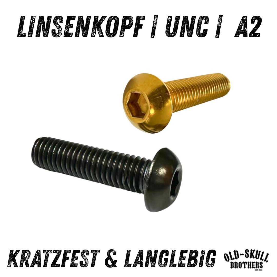 Unsere hochwertigen zölligen Linsenkopfschrauben mit amerikanischem UNC-Grobgewinde verbinden Funktionalität mit edler Optik. Gefertigt aus rostfreiem Edelstahl und veredelt mit einer langlebigen PVD-Beschichtung, sind sie kratzfest, farbstabil und extrem widerstandsfähig. Perfekt für Projekte, bei denen Qualität und Design zählen – ideal für Harley-Davidson, Custom-Bikes, US-Cars oder exklusive Tuning-Projekte.