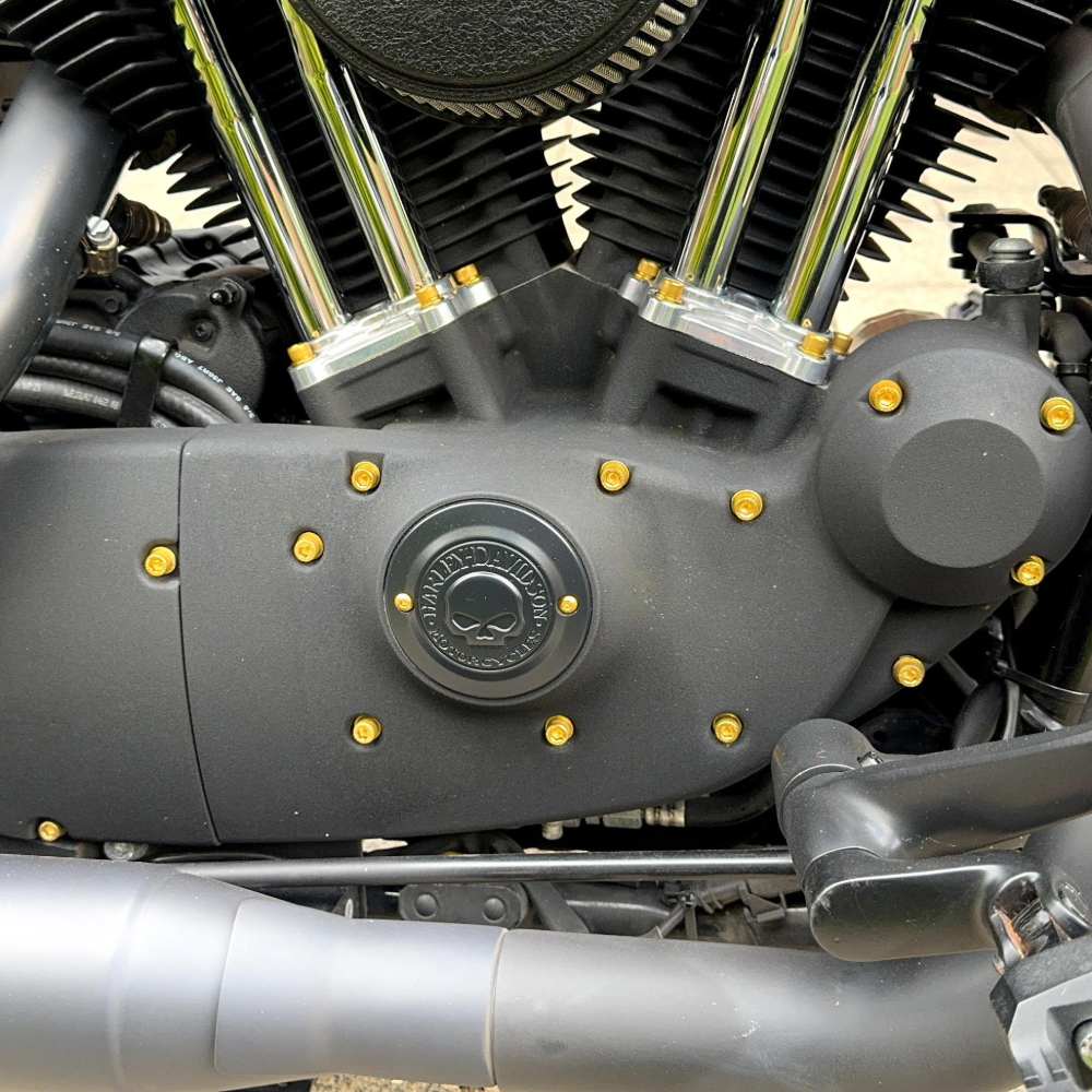 Tauche ein in die Welt unvergleichlicher Leistung und beeindruckender Ästhetik mit dem Motorschraubenset von Old-Skull Brothers für deine Harley Davidson Sportster. Dieses Set enthält PVD-beschichtete Schrauben für den Primärdeckel, Derby Cover, Inspektionsdeckel, Getriebedeckel, Timer Cover, Liter Base und Rocker Box – alles, was dein Bike braucht, um technisch und visuell zu glänzen.